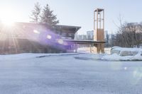 This is an image of a snowy landscape in Ontario, Canada. The photo showcases a residential area with architectural structures and concrete streets covered in snow and ice. The clear sky and sunshine create a bright and sunny winter day. In the foreground, a road winds through the landscape, leading towards the mountains in the distance. The trees are covered in white from the blizzard, adding to the wintery atmosphere. This photo captures the beauty of Ontario's winter season, with freezing temperatures and a serene landscape.