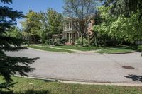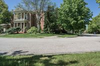 This is an image of a suburban residential road in Toronto, Canada. The asphalt road is lined with houses and home fronts, showcasing the typical suburban landscape. The photo captures a sunny day, highlighting the clear blue sky and the profile of the residential buildings. This image represents the quiet and peaceful ambiance of a suburban neighborhood in Toronto, Canada.