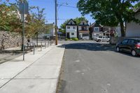 A typical suburban residential street on a clear day. Neatly lined curbs add to the neatness of the scene. The clear sky creates a cheerful atmosphere. A perfect day for a leisurely stroll.