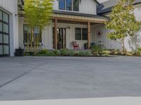 A suburban home with a well-maintained yard surrounded by lush vegetation. The concrete driveway leads to an open space with asphalt roads and tree-lined streets. Residential buildings with windows and doors create a welcoming atmosphere in this suburban neighborhood.
