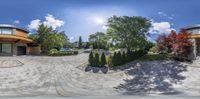 A circular walkway in a residential suburb of Toronto, Ontario. Trees and bushes adorn the walkway, contrasting with the clear blue skies. The straight road leads to a parking garage in the foreground, casting hard shadows. A serene and peaceful suburban scene.