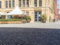 A charming courtyard in Berlin, Germany. The vacant building with its beautiful facade and windows overlook a paved open space. White umbrellas and tables invite visitors to enjoy a sunny day in this urban oasis.