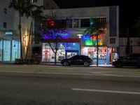 This image captures the vibrant city life of Miami Beach, Florida. At night, illuminated by neon lights, two black cars are parked in front of a colorful storefront at the corner of a street. The urban design and artificial light create a lively and energetic atmosphere. The cityscape is dotted with restaurants and buildings, while the cloudy sky adds a moody touch to the scene. This photo represents the bustling nightlife and urban charm of Miami Beach.