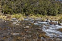 A beautiful landscape featuring a river flowing through open space, surrounded by lush vegetation and trees. The riparian zone provides habitat for various flora and fauna. This day time scene showcases the fluvial landforms of streams and the rocky bedrock.