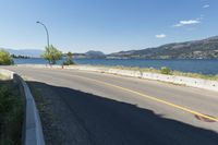 This is an image of an empty roadway near Okanagan Lake in British Columbia, Canada. The coastal landscape features a bridge and trees, with the clear sky and water reflecting the sunny day. The road surface is asphalt, bordered by a guard rail and vegetation. The scene showcases the natural beauty of the Okanagan Valley, with mountains in the distance. The image captures the peacefulness and tranquility of the area, with no visible traffic. A street light and Armco barrier can also be seen. This photo represents the serene nature and scenic views of Kelowna, British Columbia.