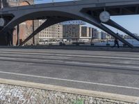 This stock photo showcases the vibrant city of Berlin in Germany. The architecture includes tall buildings with windows, lined roads made of asphalt, and a composite material bridge. The image was taken during the day with clear skies and clouds in the background. A bridge, specifically a tied-arch bridge made of concrete, serves as an important infrastructure for vehicles and pedestrians. The urban design includes vegetation, a fence, a curb, and street lights along the thoroughfare. This photo represents the classic architecture and metropolitan area of Berlin, a city in Europe.