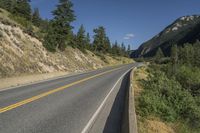 A scenic mountain road in British Columbia, Canada. The asphalt thoroughfare winds through the picturesque landscape, surrounded by lush vegetation and towering trees. The clear sky and majestic mountains create a breathtaking view.