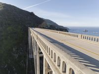 This stock photo features a scenic view of a coastal road with asphalt surface and guard rail. The road meanders along the coast and continues towards the majestic mountain in the background. The clear sky and fluffy white clouds complement the serene ocean and sea view. The image also showcases a concrete bridge, a fixed link connecting various terrains. The walkway and boardwalk parallel to the road provide a perfect vantage point to enjoy the breathtaking horizon. The road surface appears smooth, allowing comfortable transportation on this highway. The image also highlights a reservoir, a breakwater, and contrails visible in the clear sky. The hard shadow adds depth and dimension to the overall composition.