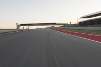 Aerial view of a straight road at dawn. The asphalt road stretches ahead with a motion blur effect, creating a sense of speed and movement. The structure of the road and the clearly marked lanes guide the automobiles along this highway. The clear sky above adds to the scenic beauty. This road resembles a race track, giving the feeling of racing or competing. The surrounding landscape includes a stadium in the distance. The image captures the excitement and energy of racing on a clear morning.