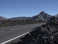the road that goes into the mountains is surrounded by a pile of rocks and lava