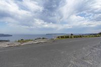 an empty road next to the water and sky with clouds in the background and two motorcycles driving along the road