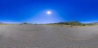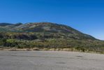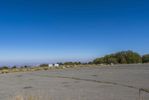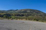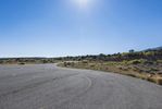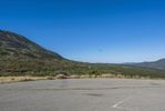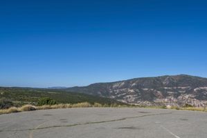 A skier's reflection of the road through the windshield of a vehicle, looking down the slope. The open space and clear sky create a picturesque landscape for winter recreational activities.
