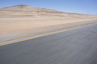 An asphalt road stretches endlessly through the vast African desert landscape. The road surfaces blends seamlessly with the sandy terrain as it leads into the horizon. The clear blue sky above is dotted with a few tints and shades of clouds. The surrounding mountain landforms and trees add beauty to the barren plain. A lone windmill can be seen in the distance, symbolizing the vastness and remoteness of this South African landscape. The motion blur effect in the image adds a sense of speed and movement to the scene, capturing the feeling of a day on the road in nature.