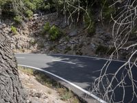 A scenic road in Spain's Balearic Islands, winding through lush forests and offering picturesque views of rocky cliffs. The winding curves and mountainous landscape make for an adventurous drive.