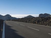 This image showcases a road surface in the Canary Islands, specifically in Tenerife, Spain. The landscape is dominated by low mountains and a volcanic terrain, creating a unique and picturesque view. The road, made of asphalt, winds through the terrain, offering stunning views of the rural surroundings. The clear sky above highlights the natural beauty of the Canary Islands, a popular destination in Europe. This photo represents the perfect blend of nature and man-made infrastructure, showcasing the unique landscape of a national park in Tenerife, Spain.