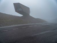 This stock photo depicts a road in Timmelsjoch, Austria, cutting through the breathtaking European landscape. The asphalt road is surrounded by fog, creating a gloomy atmosphere enhanced by the grey sky. The art installation in the middle of nowhere adds an intriguing element to the scene, making it a captivating view. This image is perfect for illustrating the beauty of nature and the mystique of remote locations.