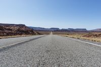 A straight road stretches into the vast desert of Utah's canyonlands. The red rock formations surround the asphalt thoroughfare, creating a stunning landscape. The road surface, marked with clear lane lines, invites travelers on an adventurous road trip through the breathtaking scenery.