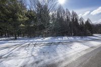 a snow covered road in front of some trees in the snow with sun shining on top of it