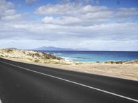 This is an image of a coastal road in Fuerteventura, Spain. The road is made of asphalt and stretches along the shore of the ocean. The landscape consists of a desert-like environment, with blue skies and clouds overhead. The image captures the beauty of nature and the serene atmosphere of the beach. This photo represents a typical day in Fuerteventura, a stunning coastal destination in Europe.