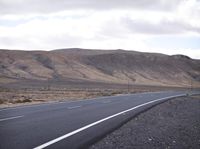 A scenic road trip through the highlands of Fuerteventura, Spain. The asphalt road winds through rugged mountain landforms, offering breathtaking views of the desert landscape. The grey sky adds a dramatic touch to the vast horizon. Explore the beauty of nature and discover the hidden gems of this European island on this adventurous journey.