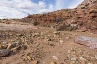 This stock photo showcases the stunning desert landscape in Utah, USA. The image depicts a low, sandy road winding through the vast open space surrounded by red rock mountains and cliffs. The rugged terrain features bedrock outcrops, rubble, and gravel, showcasing the unique geology of the area. In the distance, a cloud-filled sky adds depth to the composition. The image captures the beauty of the rural, off-road terrain and invites viewers to explore the untouched beauty of Utah's badlands and canyons.
