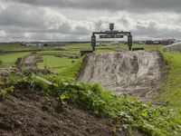 A scenic view of a straight road surrounded by lush green fields and highland hills in the United Kingdom. The track, perfect for off-road racing, is located in the rural countryside. The landscape is dotted with walls and farm fields, creating a serene and rugged environment. The Matterley Basin Grand Prix track is a popular destination for rally and dirt racing enthusiasts.