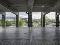 This image captures the urban landscape of Berlin, Germany. The photo shows a concrete street leading straight down the road, surrounded by modern architecture and an open parking garage. The empty parking garage has open doors on the side and is enclosed by a wire fence. The cloudy sky overhead adds to the overall atmosphere. This photo showcases the urban design and architecture of Berlin, capturing the modern and dynamic feel of the city.