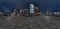 a street scene with fish eye lens images of buildings and city lights at night time