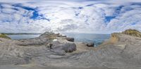 A fish-eye photo captures the stunning view from rocky cliffs overlooking the ocean. The beach is visible through the clear water. The grey sky adds a touch of gloom to the otherwise sunny day.