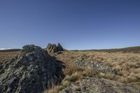 A rocky hilltop overlooks a vast expanse of dry grass, covered in moss, surrounded by highland vegetation. The clear sky and unobstructed horizon make for a serene rural landscape.