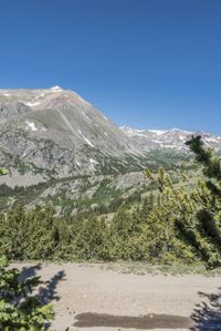 a view of mountains from a trail in the rockies under a blue sky, with some trees