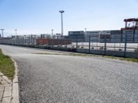 This image captures a clear sky over Bremen, Germany. The cityscape is dominated by industrial buildings and factories, with roads and parking lots lined with vegetation on one side. In the background, the harbor and the container port can be seen, showing the importance of the maritime industry in Bremen. The image portrays a typical day in this European city, full of activity and movement. The road surface and asphalt are well-maintained, with street lights guiding the way. The pier and jetty are prominent features, symbolizing the city's connection to the water.