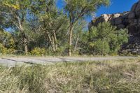 A road winding through a rugged desert landscape. The asphalt contrasts with the dry vegetation and groves of trees. Clear skies overhead highlight the beauty of this recreational area.