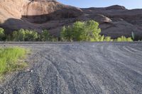 A rugged road in the desert of Utah, surrounded by red rock formations. The straight path cuts through the wilderness and offers a stunning view of the canyonlands. Clear sky and contrails add to the picturesque landscape.