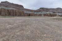 A rugged and gloomy landscape in the San Rafael Swell region of Utah, USA. Red rock formations and canyons contrast with the grey sky. The open space and badlands provide a dramatic and breathtaking natural setting.