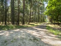 This is an image of a rugged road in Berlin, Germany. The dirt road winds through a dense forest, flanked by tall pine trees. The natural landscape showcases the beauty of nature and the tranquility of the area. Above, the clear blue sky provides a serene backdrop to the scene. This photo represents an off-road adventure through the wilderness, away from the hustle and bustle of city life.