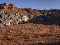 This is an image of a rugged mountain road in Shangri-La, Yunnan, China. The landscape features open spaces with mountain landforms and rocky outcrops. The clear sky adds to the beauty of the scenery. The road is made of dirt and gravel, showcasing the rugged surface. This photo captures the wild and untouched nature of the Yunnan wilderness. The geology of the area can be seen in the exposed bedrock and soil formations. The scene resembles the landscape of Mars, giving it a unique and otherworldly quality.