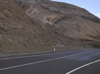 Rugged mountain landscape in Fuerteventura, Spain. A winding asphalt road cuts through the desert terrain. Clouds hover above the mountain peaks. A picturesque day in Europe's breathtaking geology.