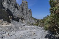 This stunning stock photo captures a rugged mountain landscape featuring a rocky cliff face. The high angle perspective showcases the impressive bedrock and rock surface, giving a sense of depth and scale. The clear sky and beautiful cloud formations add to the natural beauty of the scene. The absence of any visible individuals emphasizes the untouched nature of this off-road track. The surrounding vegetation and trees provide a contrasting touch of green against the gravel terrain. This image perfectly encapsulates the ruggedness and serenity of this mountainous region.