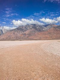 A scenic view of a mountain landscape with a road winding through the rugged terrain. The sky is filled with fluffy cumulus clouds, creating a dramatic horizon. An ideal destination for outdoor activities.