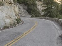 This is an image of a scenic mountain road in California, USA. The photo was taken at dawn, capturing the beautiful golden hues of the landscape. The road surfaces are smooth asphalt, winding through low mountains and rocky terrain. The highway is lined with tall trees, adding to the natural beauty of the area. In the distance, you can see the rugged rock walls and the armco barriers along the thoroughfare. This picture represents the breathtaking nature and stunning infrastructure found on California's mountain passes.