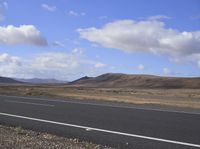 This image captures the scenic landscape of Fuerteventura, Spain. The picture shows a road surrounded by rugged mountains and a vast desert plain. The asphalt road surface winds through the highlands, offering a perfect backdrop for a road trip. The clear blue sky and fluffy clouds add to the beauty of the natural environment. The contrast between the mountain landforms and the plain creates a stunning visual effect. This photo represents the untouched beauty of nature in Europe.