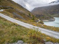 Rugged off-road track in Europe, winding its way through gloomy mountains and beside a serene lake. The car drives down the dirt road, surrounded by the grey sky and the beautiful landscape.