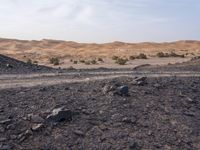a truck on a dirt road in the desert with rocks and stones on the ground