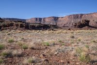 This stunning stock photo captures the majestic beauty of the Moab landscape in Utah. The image features the mountains rising from the ground, with a mix of brown, brown, and green terrain in the foreground. The red rock formations and bedrock outcrops create a mesmerizing contrast against the clear blue sky. The rugged canyonlands and open spaces of Hurrah Pass and Kane Creek Road provide a perfect backdrop for off-road adventures and nature exploration. With its low mountain peaks and vast expanse of desert, Moab offers a unique and picturesque setting for outdoor enthusiasts. The dirt and gravel surface, along with the grassy patches, add to the natural charm of this scene. Whether you're a photographer, traveler, or nature lover, this image is sure to inspire and captivate.