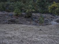 a bear walking through the grass in a forest area that's burnt by fire