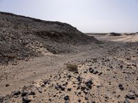 a truck on a dirt road in the desert with rocks and stones on the ground
