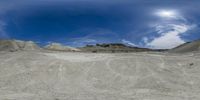A stunning view of the Utah landscape with red rock mountains and open spaces. The sky is clear and the terrain is rugged, showcasing the unique geology and badlands of the area. A fish-eye lens adds a unique perspective to the image.