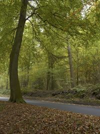 A person running on a scenic road, surrounded by a beautiful forest with foliage in Hamburg, Germany. The road is made of asphalt and lined with trees, creating a picturesque landscape. The image captures the natural environment and serenity of the woods during the autumn season, with deciduous leaves creating a vibrant and woody green scenery. This image represents the beauty of nature in Europe, particularly in Hamburg, Deutschland.