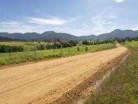 This image showcases a beautiful rural landscape in New South Wales, Australia. The photo captures a long and winding asphalt road, surrounded by lush green grass and vegetation. In the distance, majestic mountains can be seen, adding to the picturesque scenery. The sky is clear with faint contrails trailing across it. The road surface is smooth, making it perfect for off-road adventures. This photo perfectly represents the natural beauty and tranquility of the Bega Valley region in New South Wales, Australia.